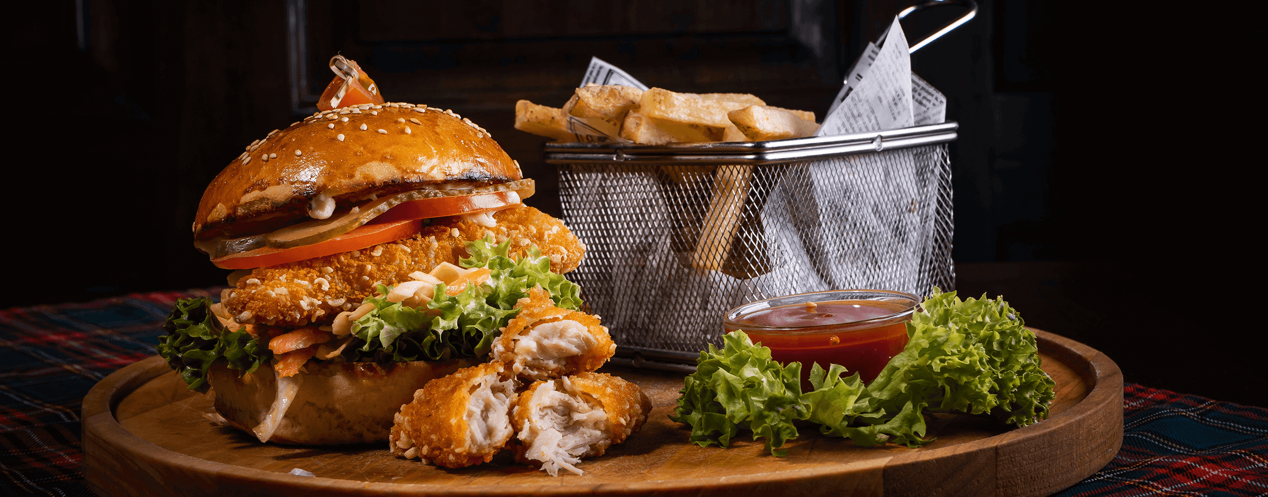 (Served with Brioche Bun, Cheese, Tomato, Lettuce, Red Onion & Coleslaw Served with Chips and Tomato Sauce)
